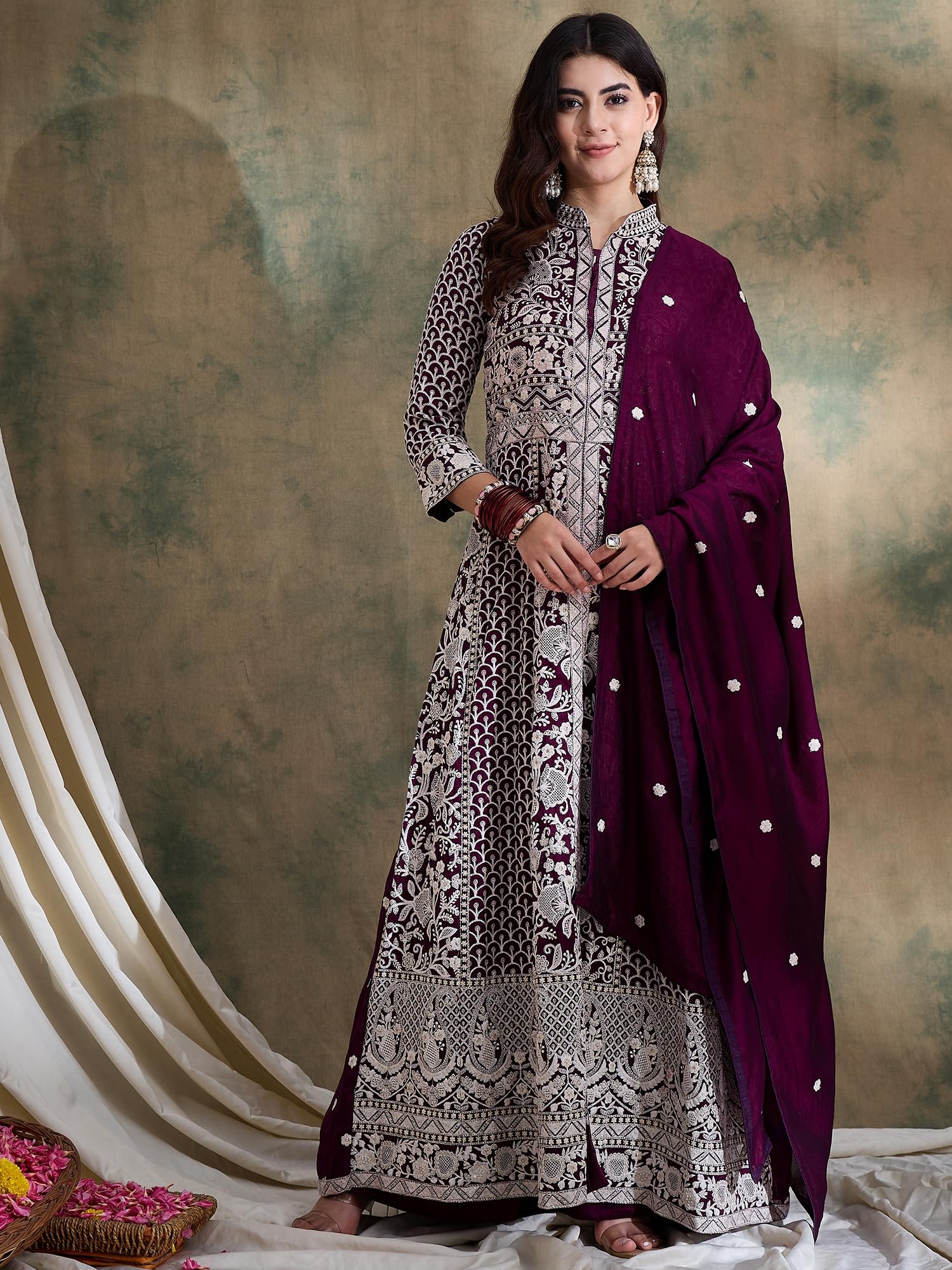 Miss Ethnik Women’s Purple Vichitra Silk Stitched Top With Stitched Vichitra Silk Bottom and Vichitra silk Dupatta Full Sleeve Embroidered Anarkali Gown (ME-1165-Purple-XXL)
