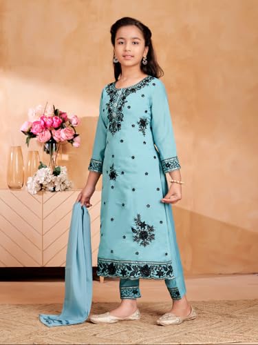 Aarika Girls Ethnic Wear Turquoise Colour Thread Sequin Embroidery Kurti Pant Set With Dupatta-(4-10 Years)-(KP-9540-FIROZI-28)