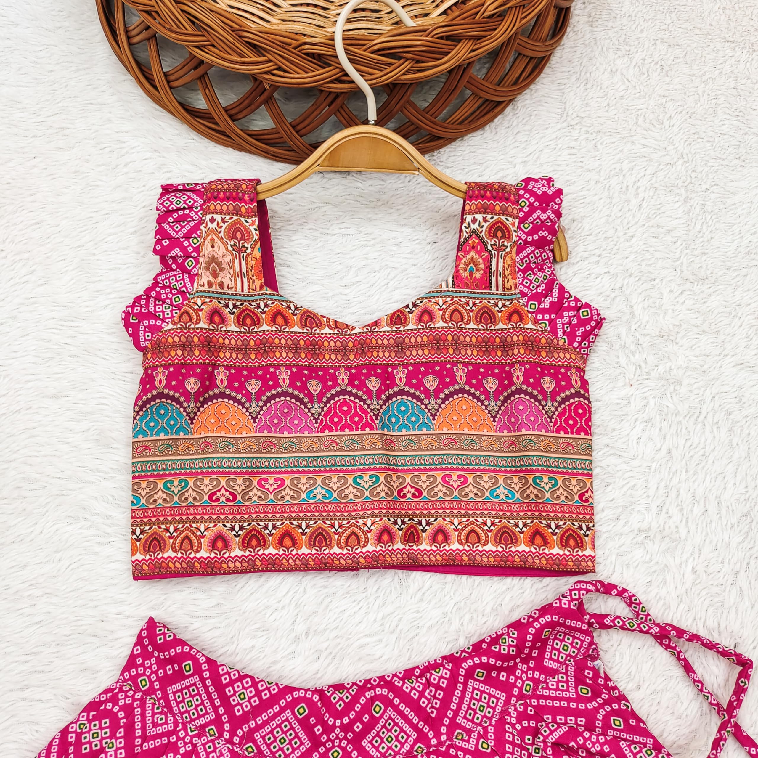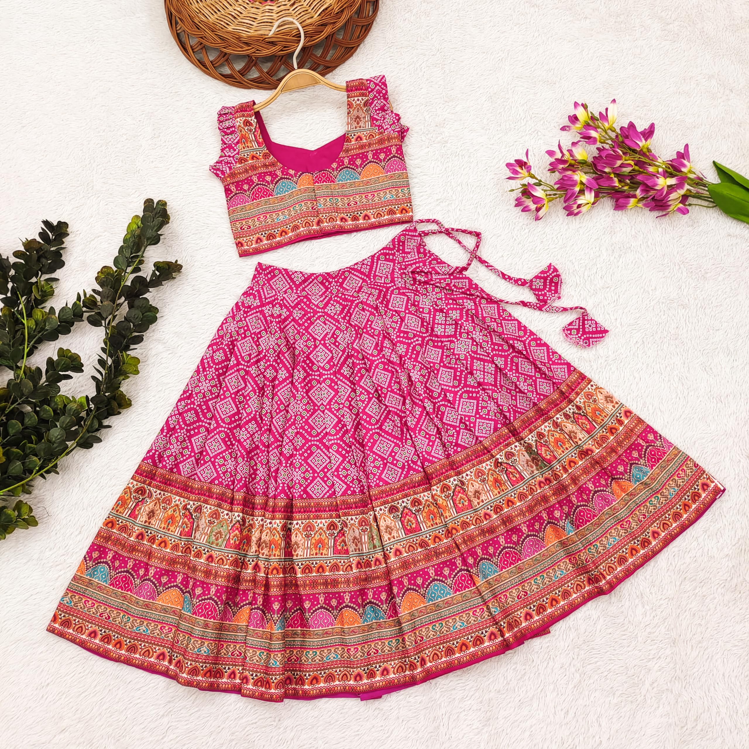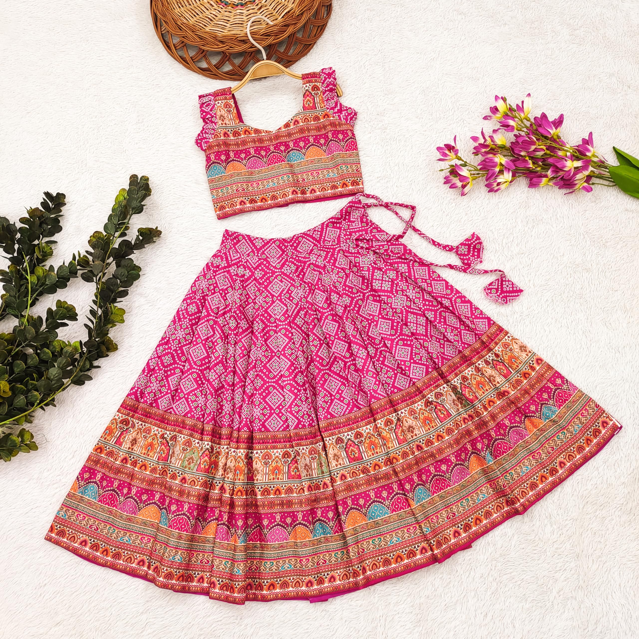 Bridezilla Fab Girls New Latest Rayon Silk Bandhani Print Readymade Lehenga Choli With Dupatta Set – Traditional Ethnic Navratri Dress – Kids Party Dress – 2-8 Years (6-7 Years, Pink)
