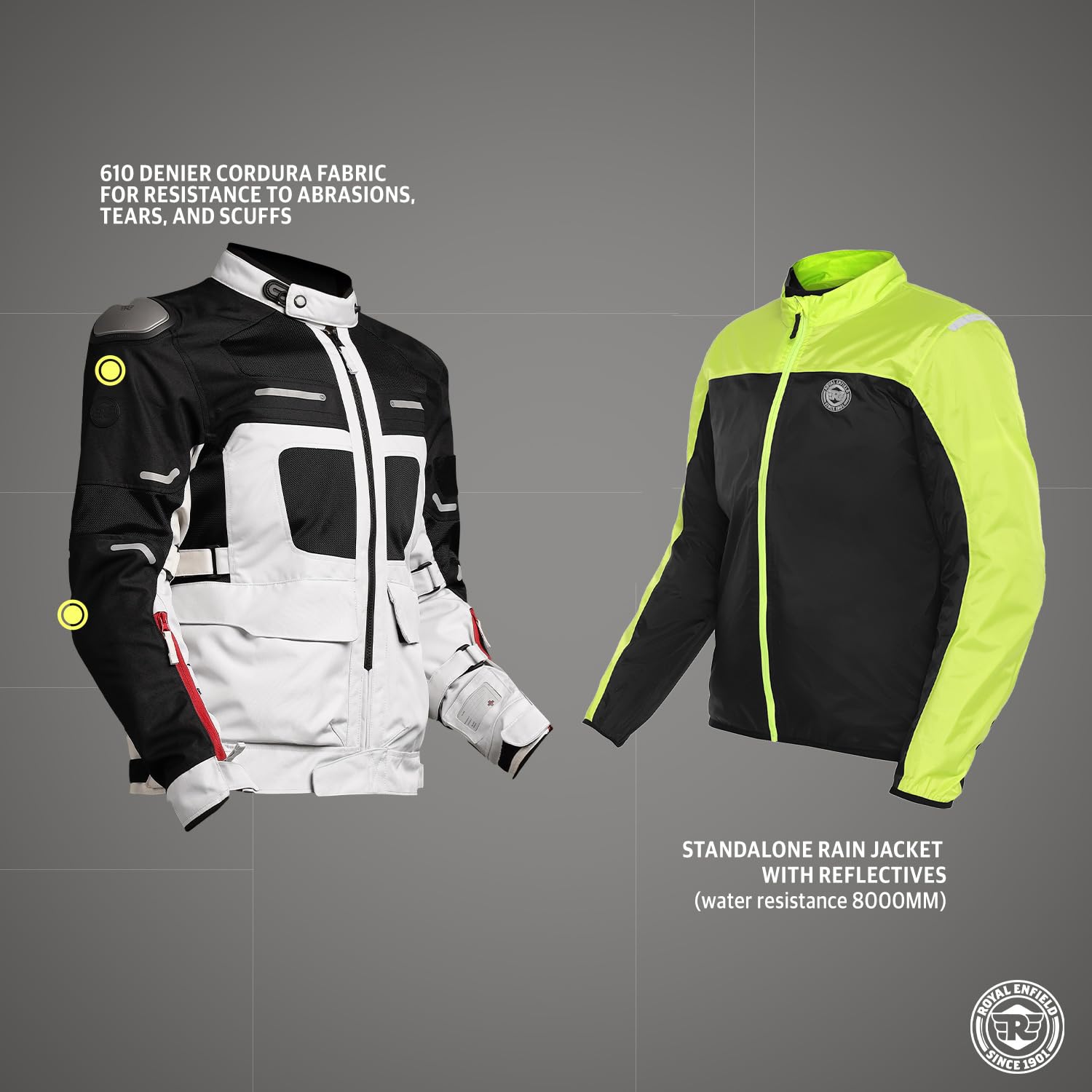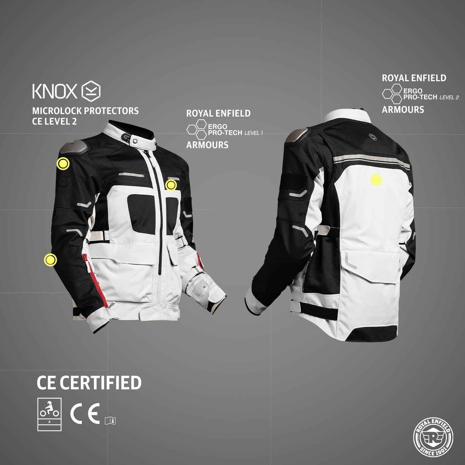 - Impact Protection: KNOX Microlock protectors CE LEVEL 2 at Shoulders and Elbow. Royal Enfield Ergo Protech armours CE level 1 at chest.Royal Enfield Ergo Protech armours CE level 2 at backThe jacket’s impact zones are reinforced with 610D polyester Cordura fabric, and Titanium Metal Sliders at shoulders provide an extra layer of defense. Cordura fabric is well-known for its resistance to abrasion, tear, and scuff resistance.