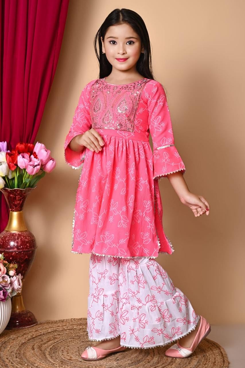FIRST DREAMKids Ethnic Wear Red Cotton Floral Printed Angrakha Kurta Sharara Set For Girls Suitable for 6 Years-7 Years