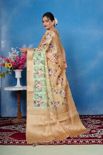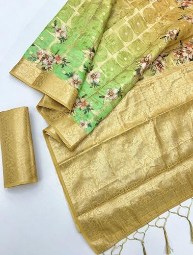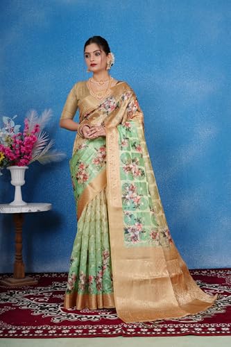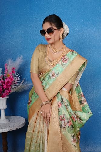 izkio Soft Georgette Saree with Floral Print, Digital Weave Pattern, Jacquard Border (Light Green)