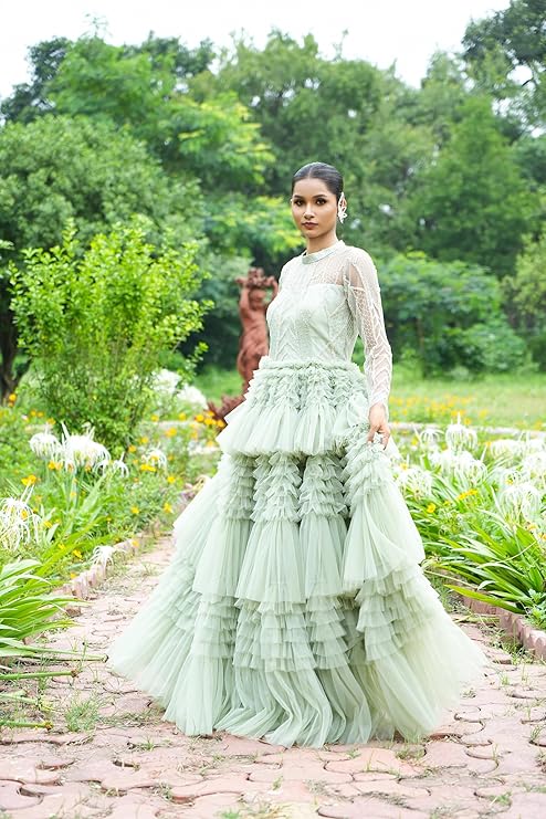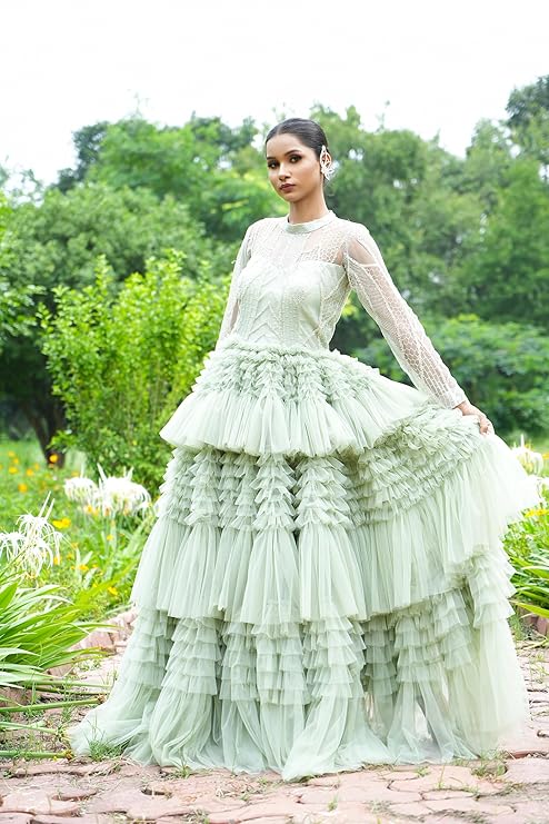 - Design Detail: This pastel green gown features a striking multi-tiered ruffle design in soft net, paired with a beautifully hand-embroidered bodice adorned with cutdana and pearl work. The fitted sheer sleeves and structured silhouette create a regal yet modern statement, perfect for grand occasions.