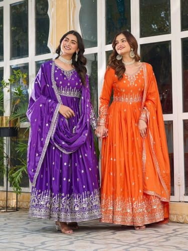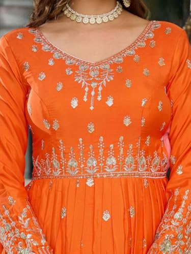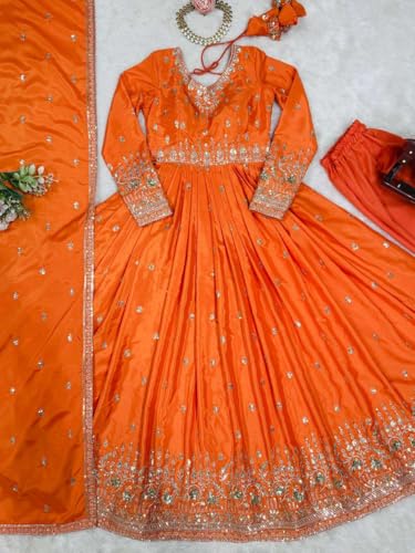 M/S PREM CRAFTS Women’s American Silk Sequence Embroidery Long Anarkali Kurti (Gown) with Dupatta (Orange-XXL)