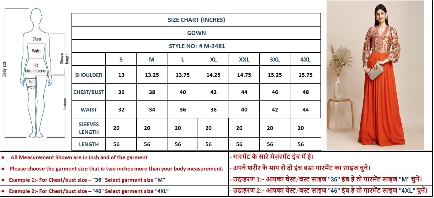 - Versatile Dress for All Occasions: Pair the Orange Color Anarkali Chinon Embroidery Work Gown by Madhuram Textiles with palazzos, pants, or jeans for a contrasting and stylish look. Perfect for various occasions, this gown is excellent for everyday wear, office wear, ethnic occasions, marriage parties, and birthday celebrations for women and girls. Make a statement wherever you go with this versatile and elegant gown from Madhuram Textiles
