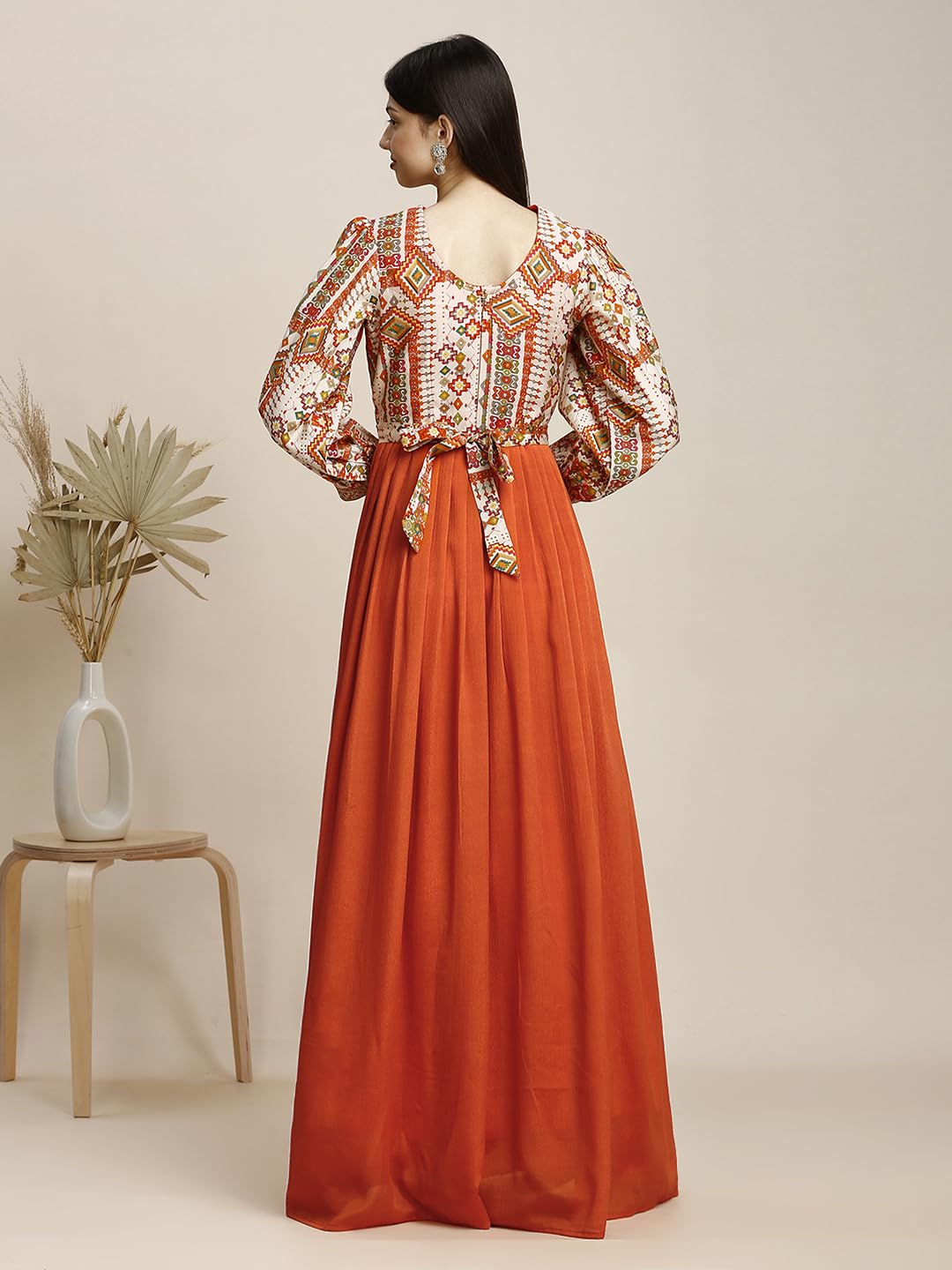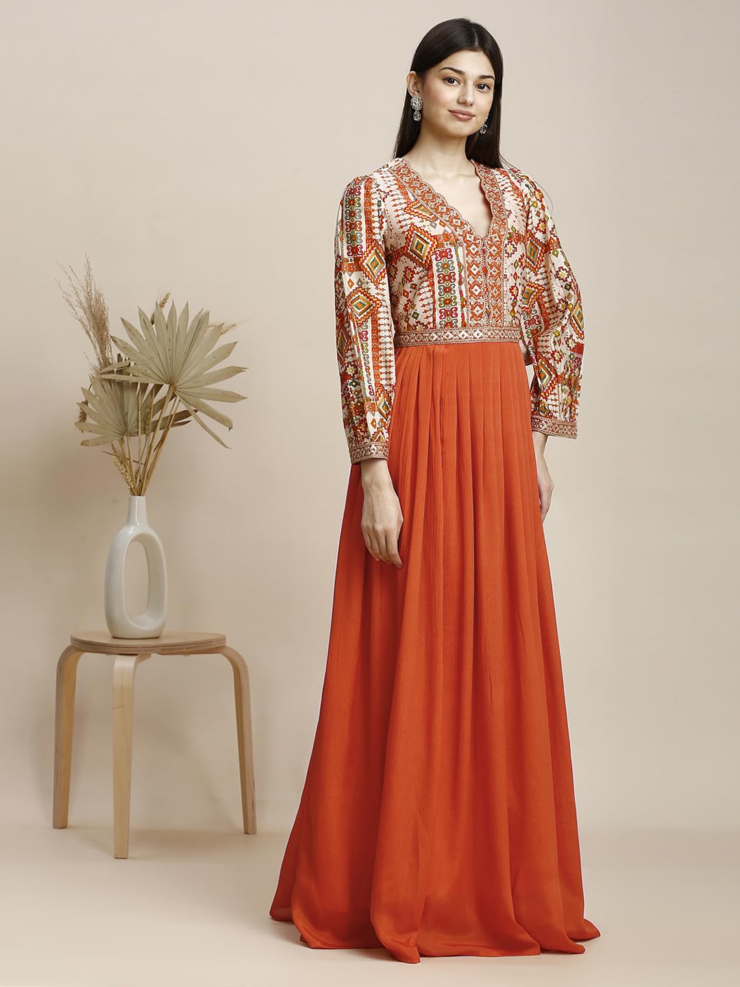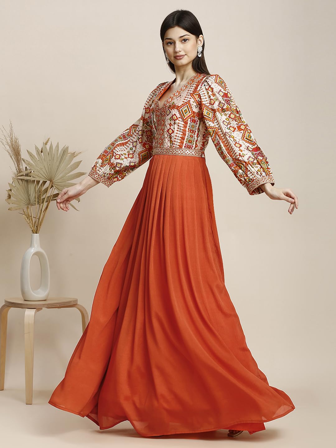 madhuram textiles Womens’ Chinon Embroidery Work Long Gown(M-2481 Orange_Medium)