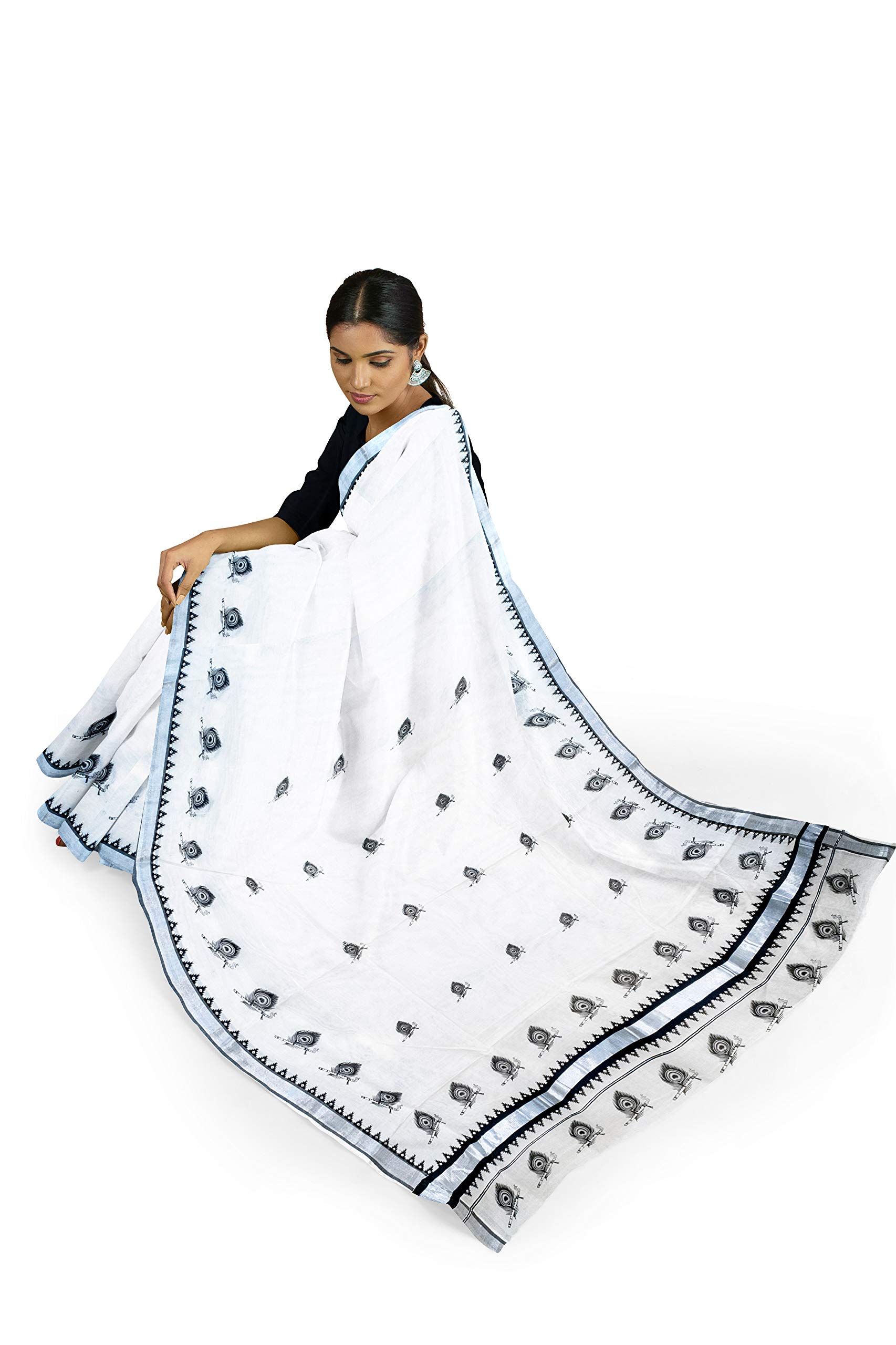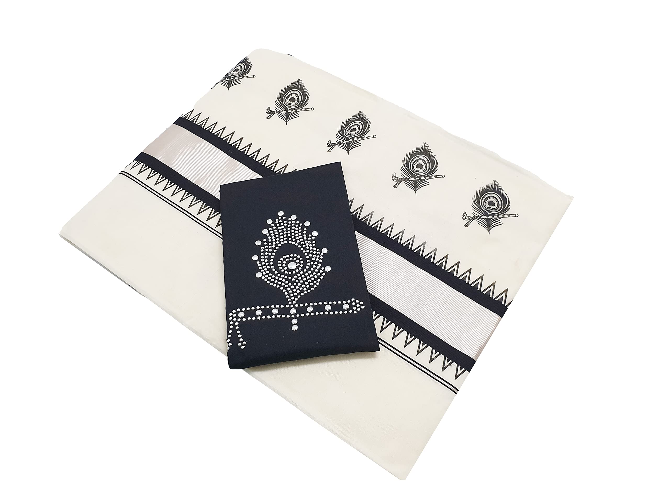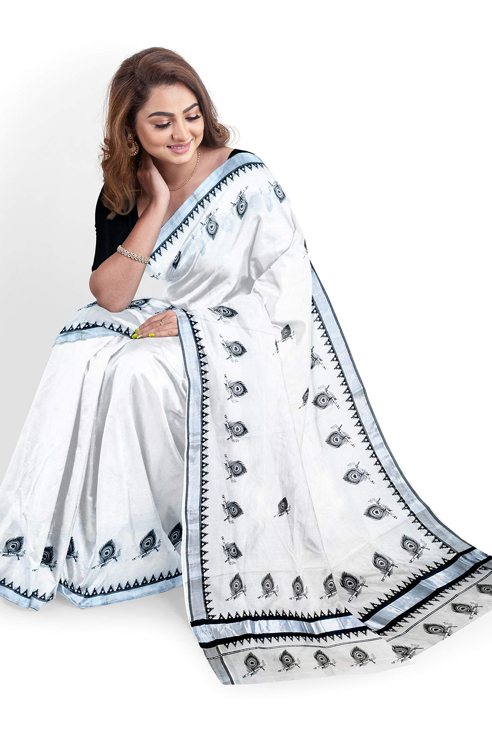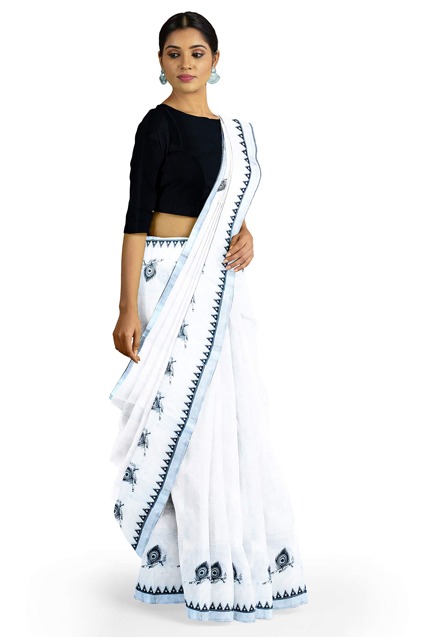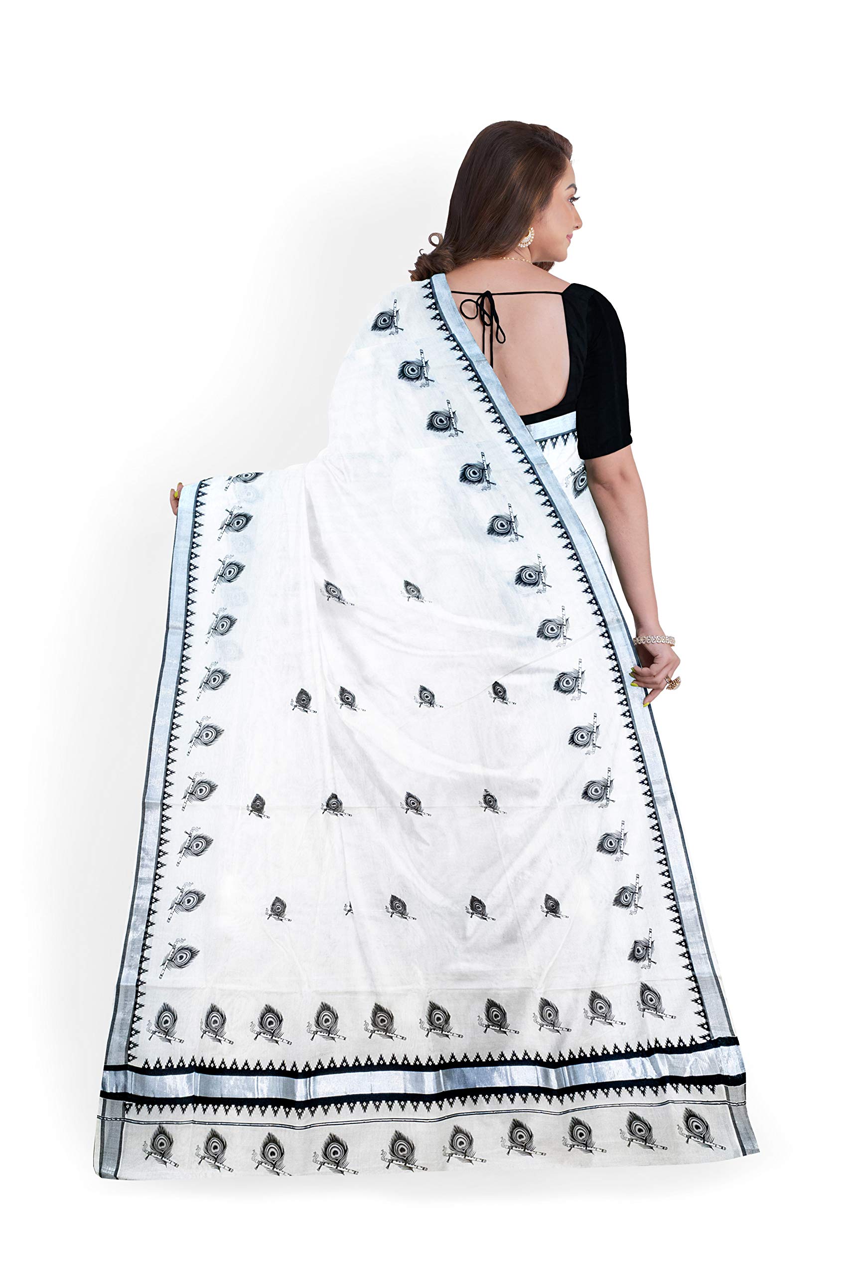 mylooms Womens Kuthampully Cotton Printed Kerala Saree Silver Black Set saree