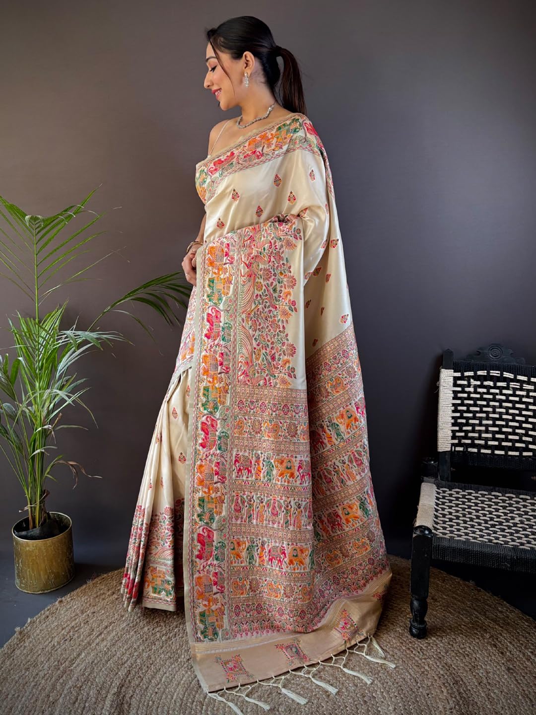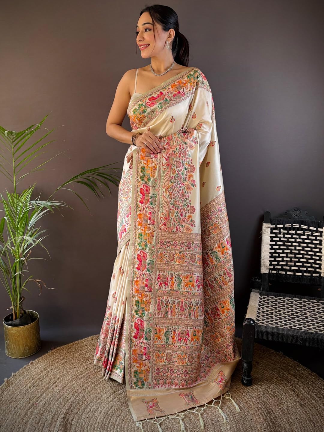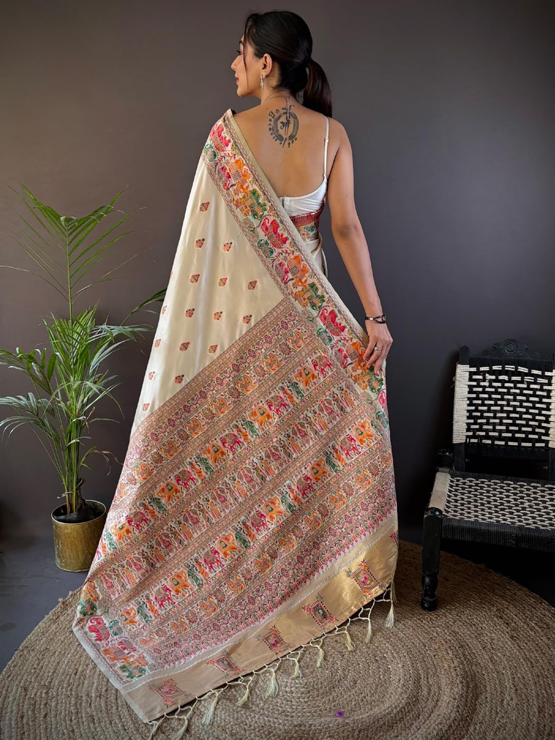 Panzora Women’s White Pashmina Silk Weaving Saree With Unstitched Blouse Piece