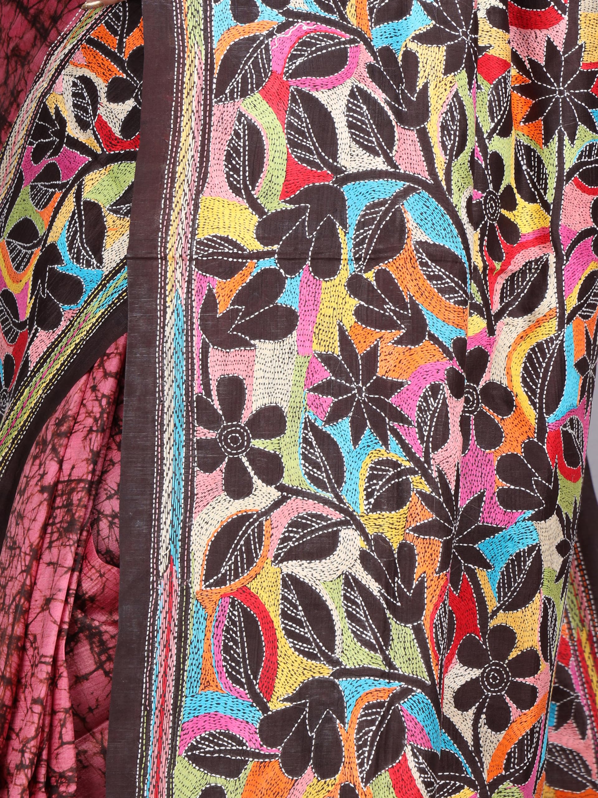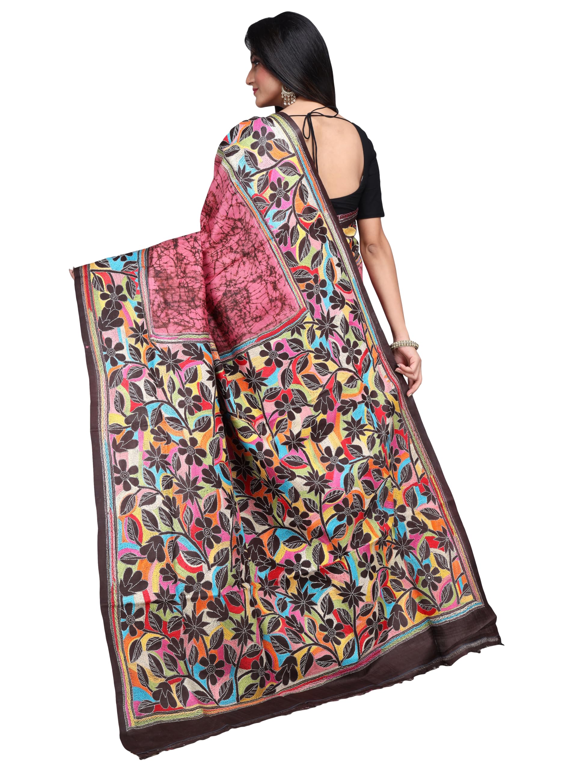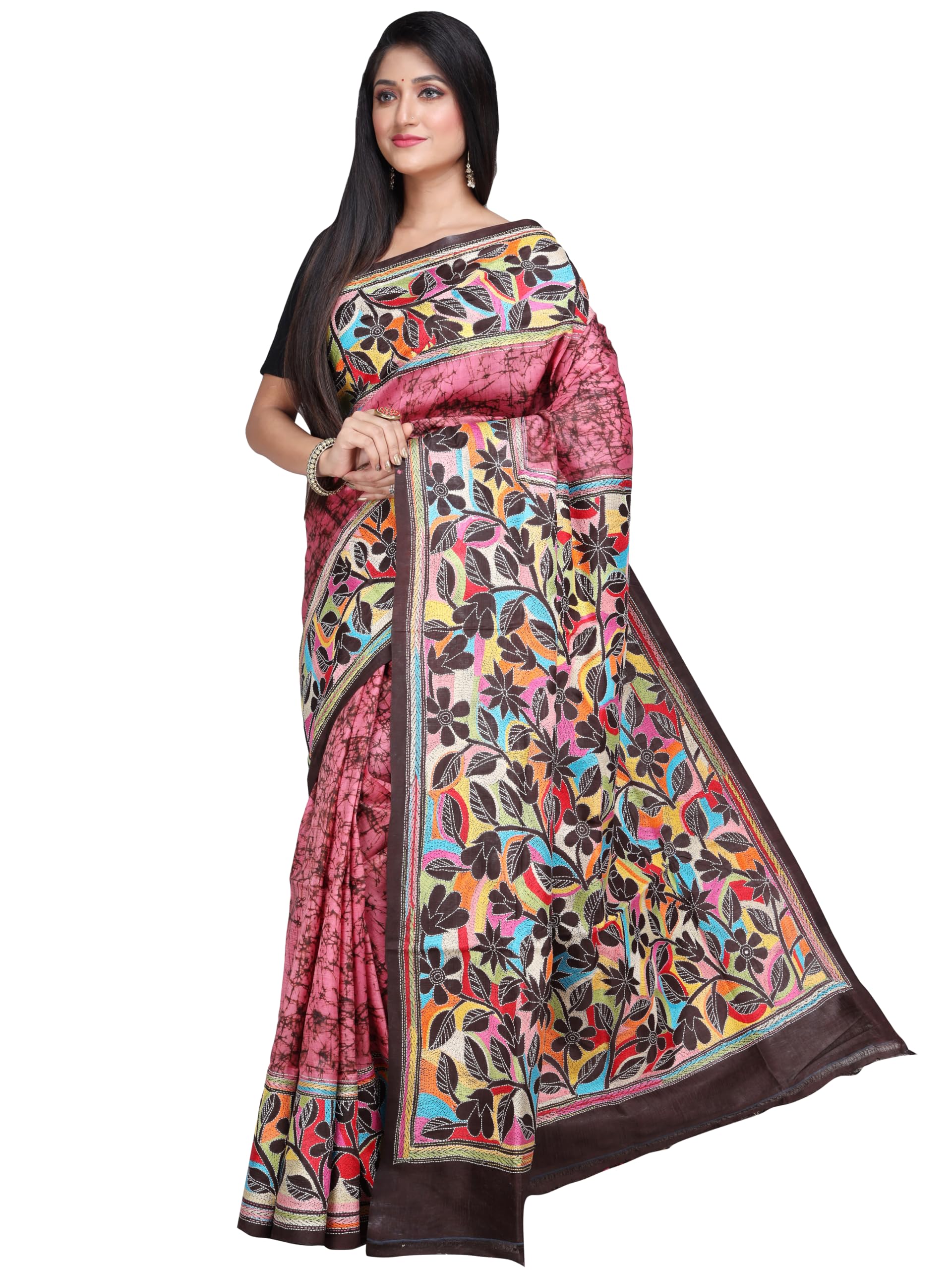 - Pure natural silk hand embroidered Kantha stitch on batik printed saree with running blouse piece