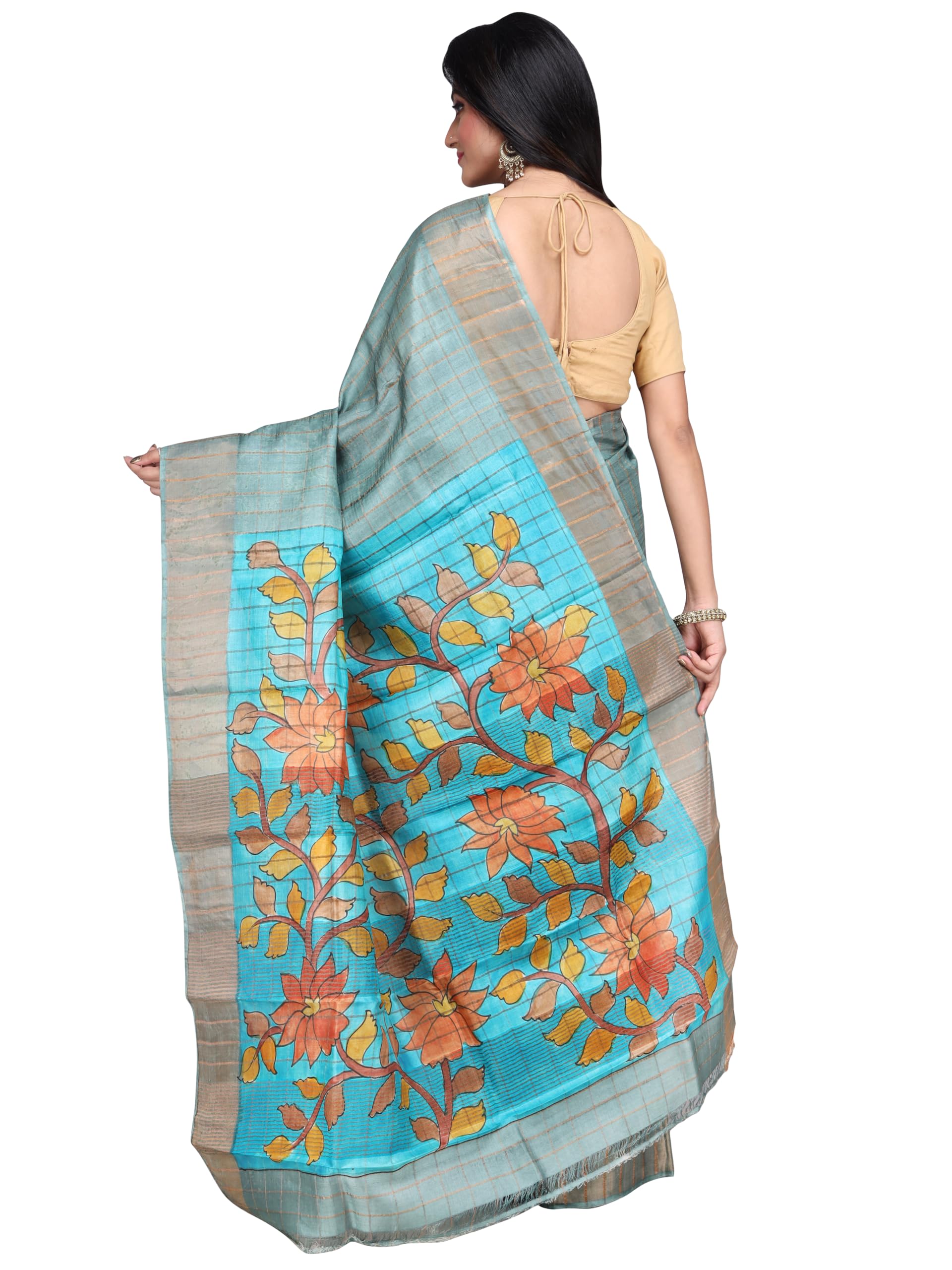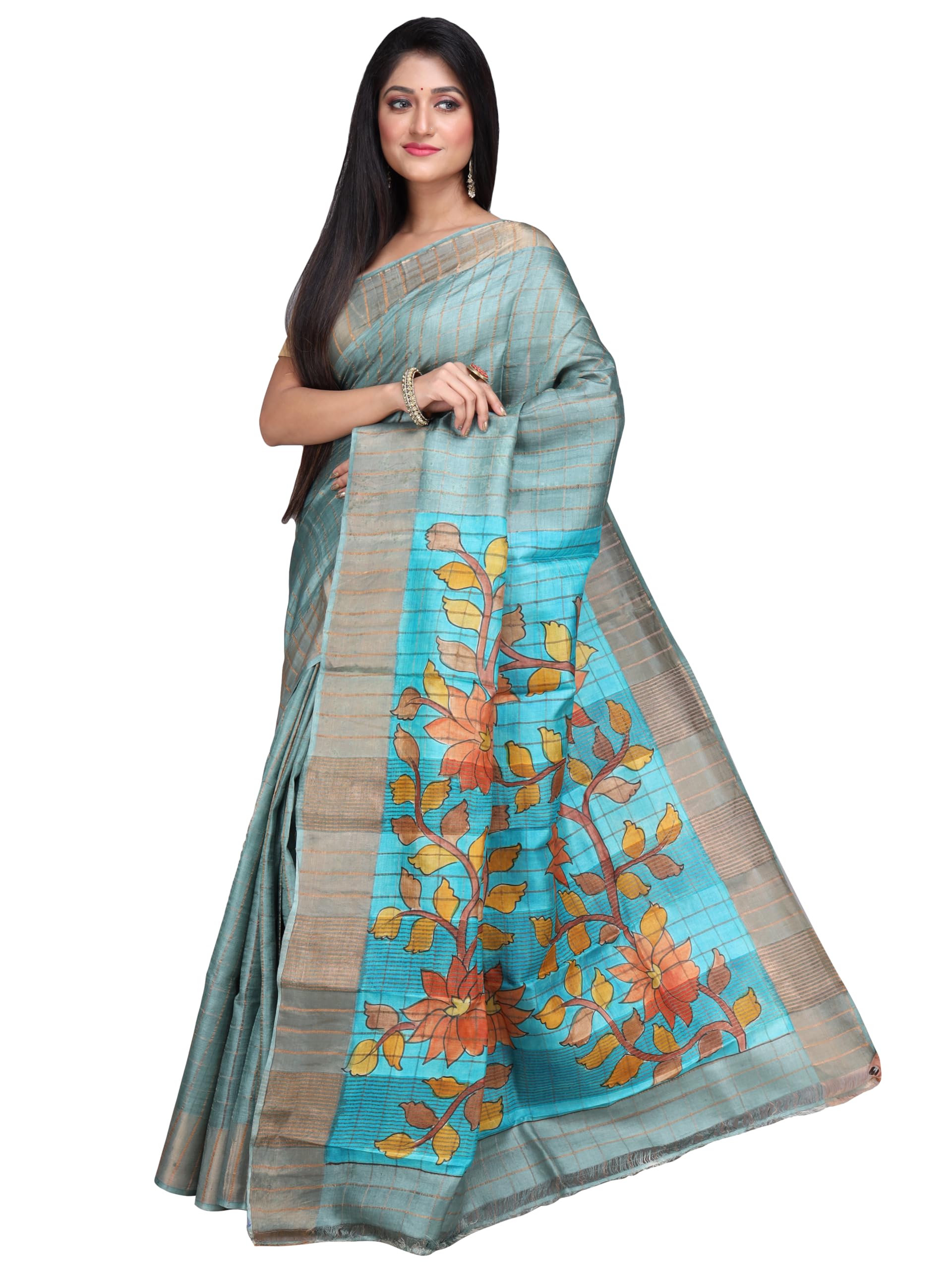 Ruprekha Fashion Women’s Pure Tussar Silk Zari Check Kalamkari Design Hand Painted Bengal Handloom Saree