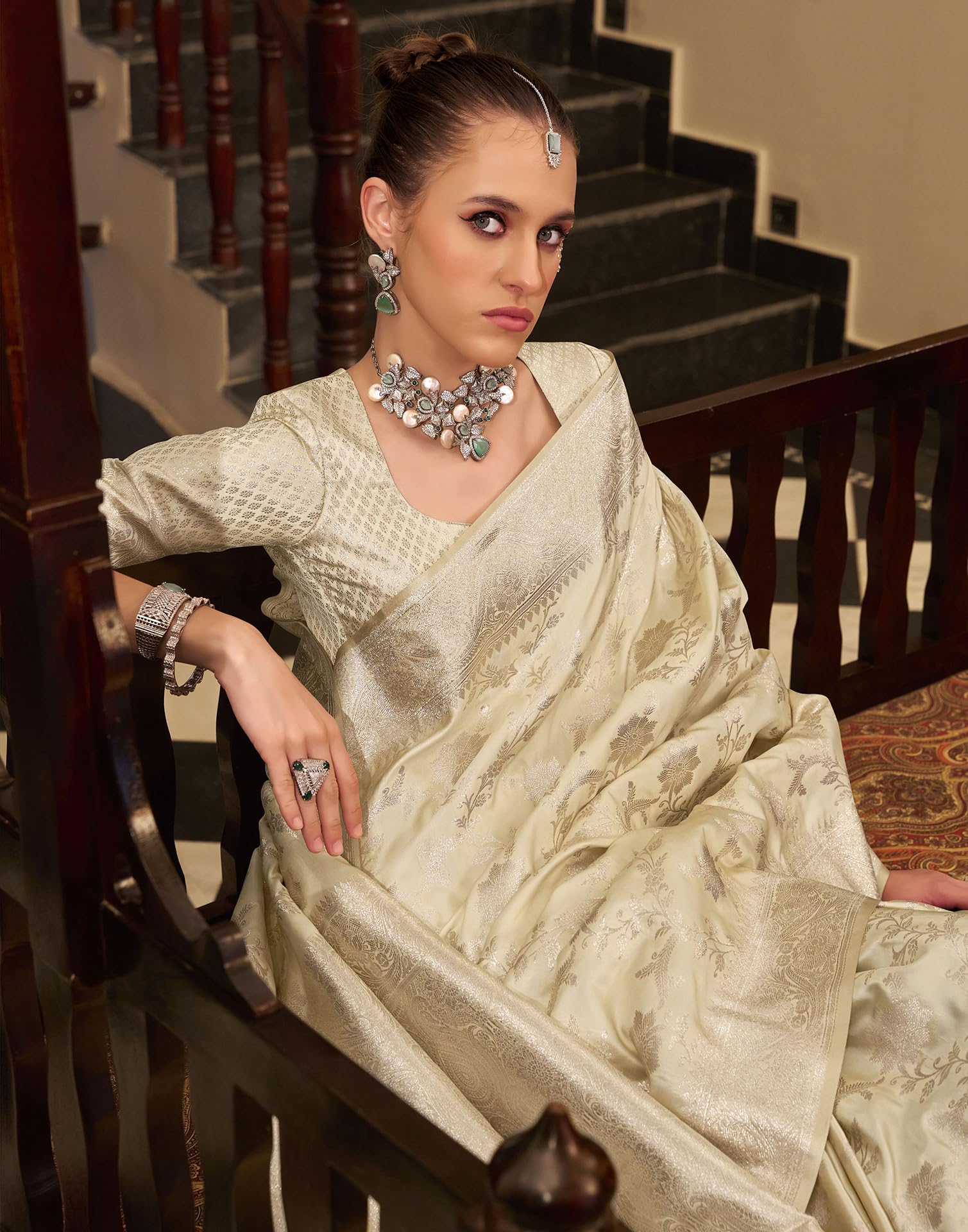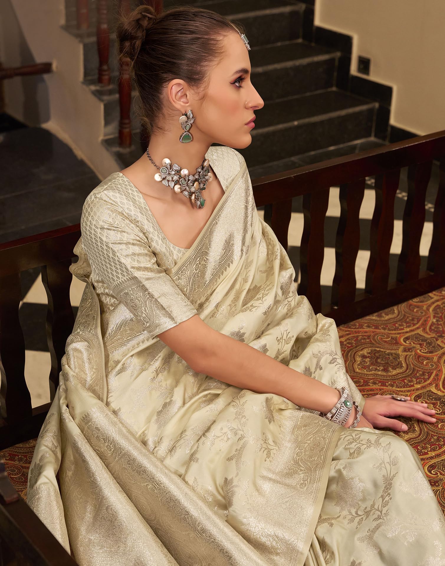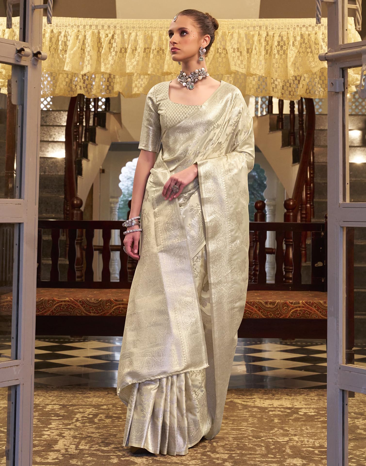 - Saree Details : Saree Fabric: Silk | Blouse Fabric: Silk | Saree Work: Jacquard | Blouse Work: Weaving | Saree Color: Cream | Blouse Color: Cream, Golden
