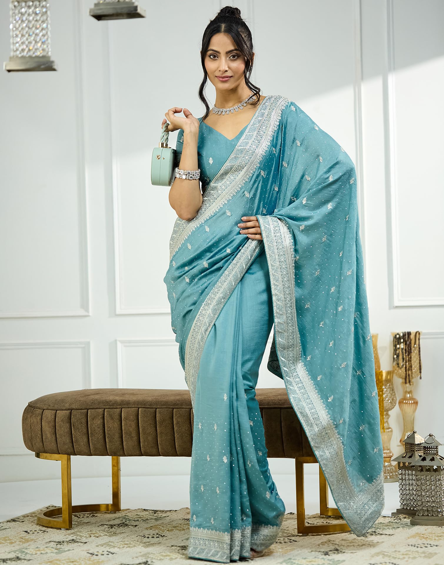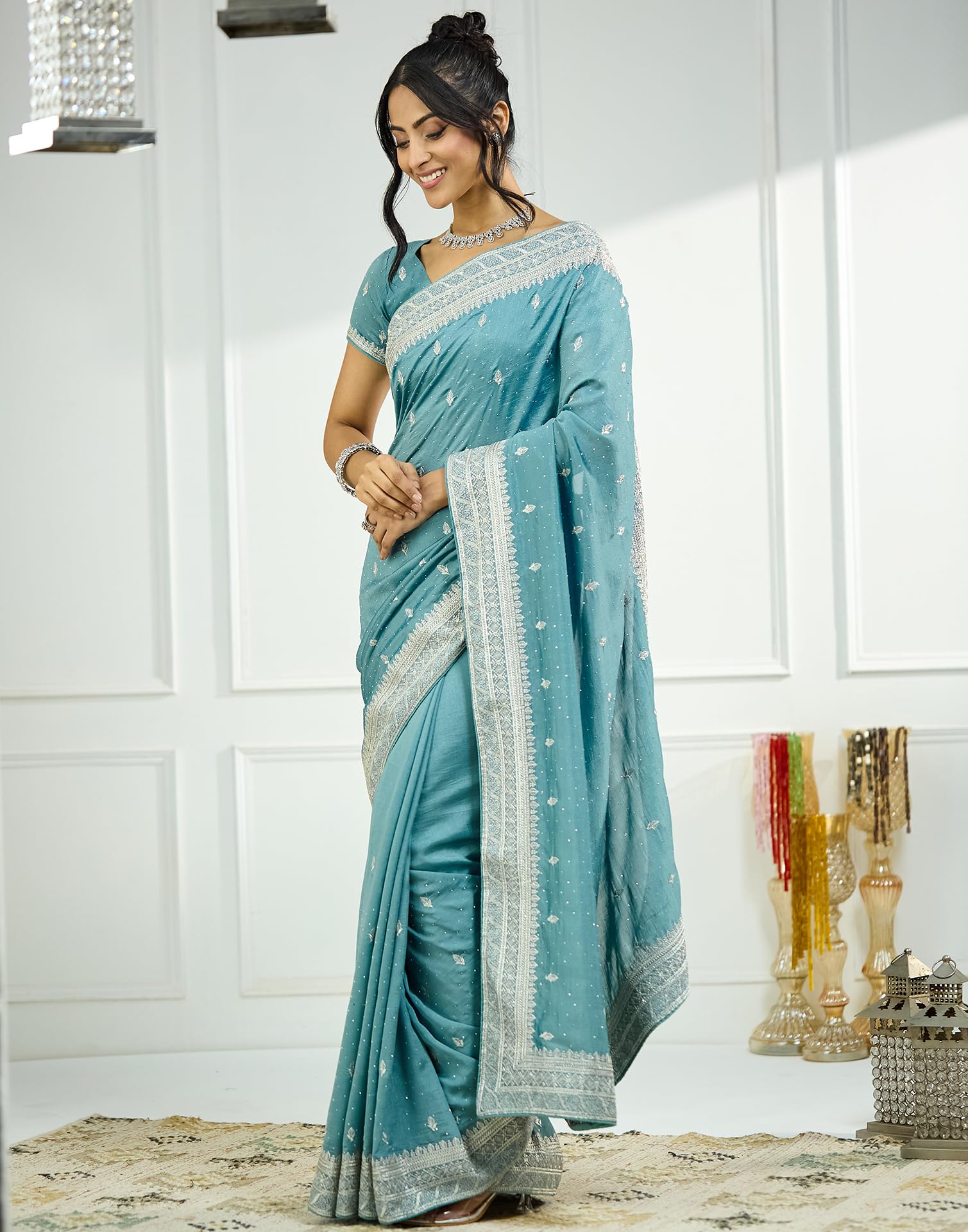 SIRIL Women’s Silk Blend Embroidery Stone Work Saree With Unstitched Blouse Piece (4022S617_Light Blue)