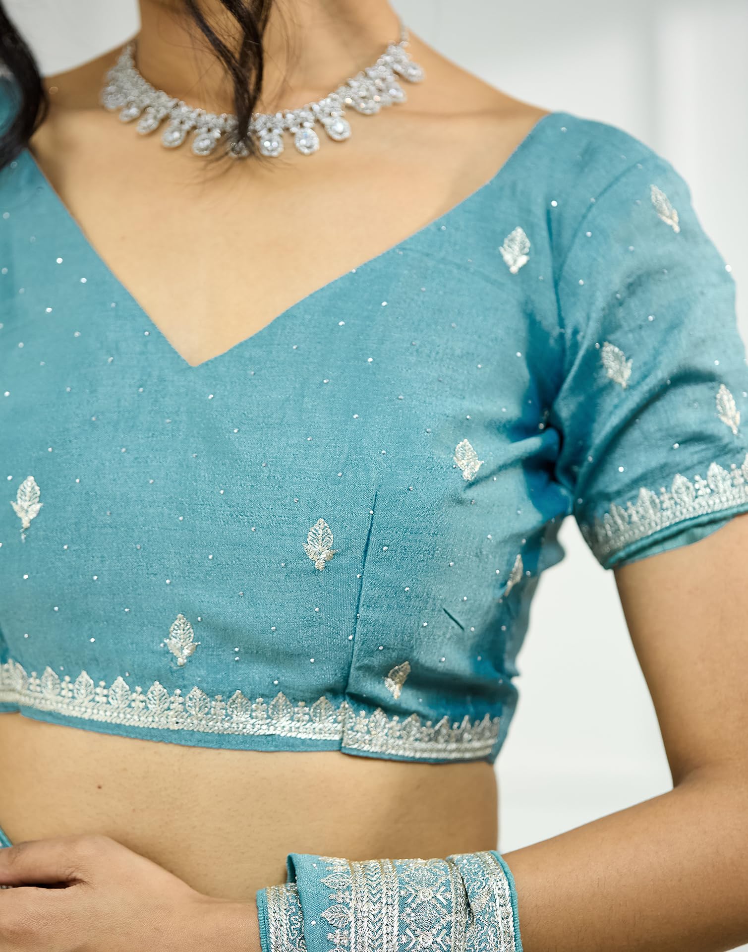 - Colour:: Saree Color: Light Blue | Blouse Color: Dusty Blue