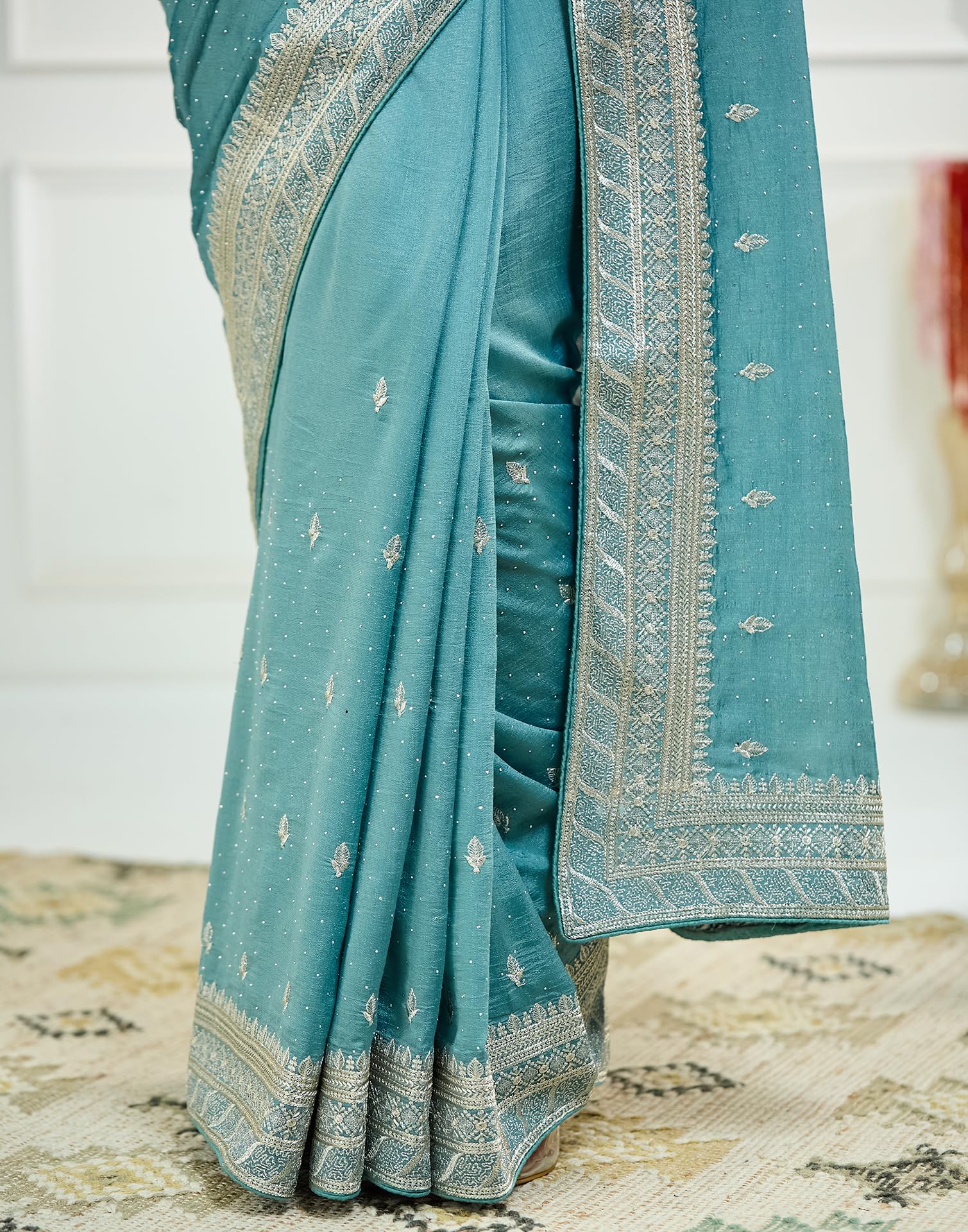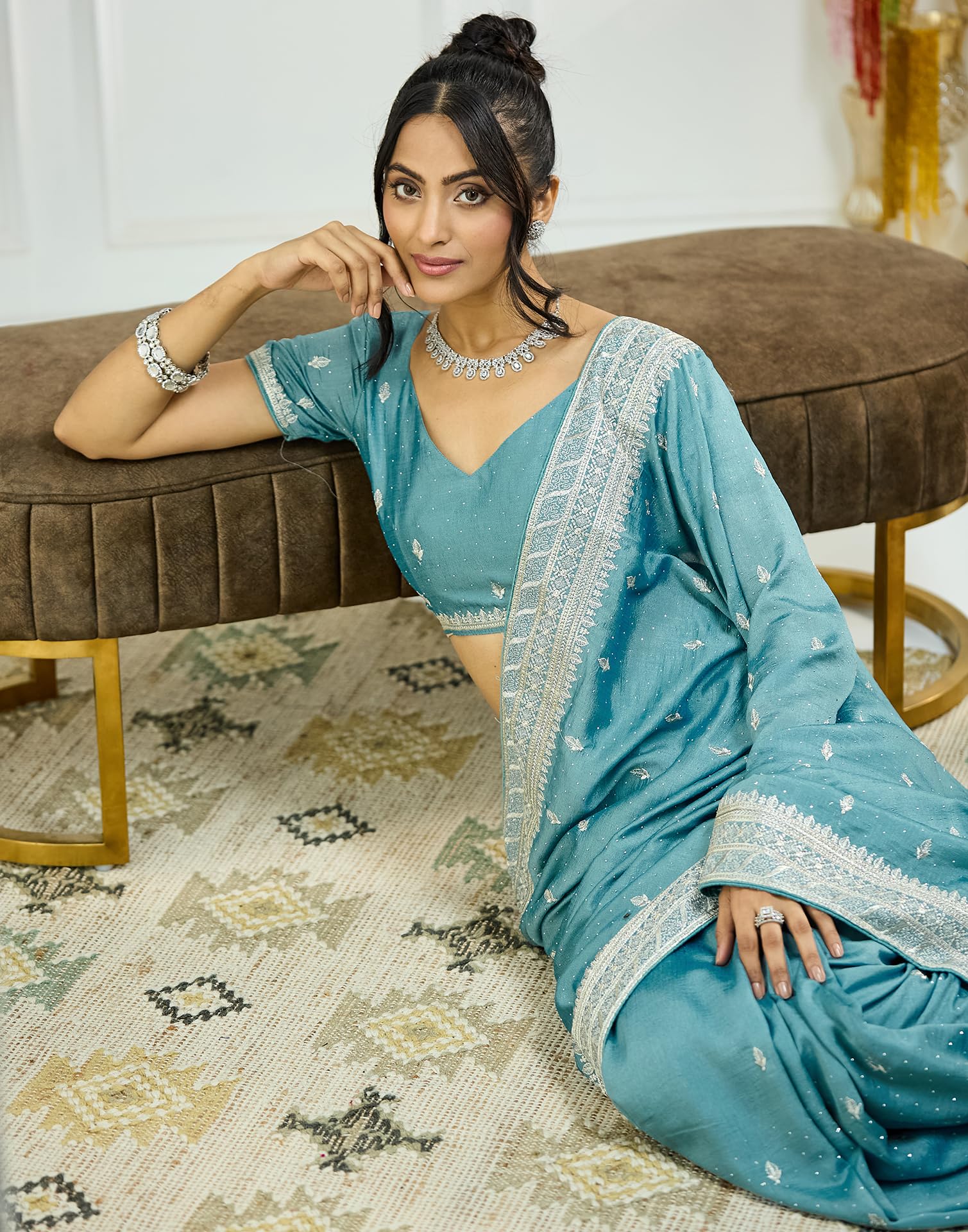 - Saree Fabric: Silk Blend | Blouse Fabric: Silk Blend | Work:: Saree: Embroidery Stone Work | Blouse: Embroidery, Stone Work