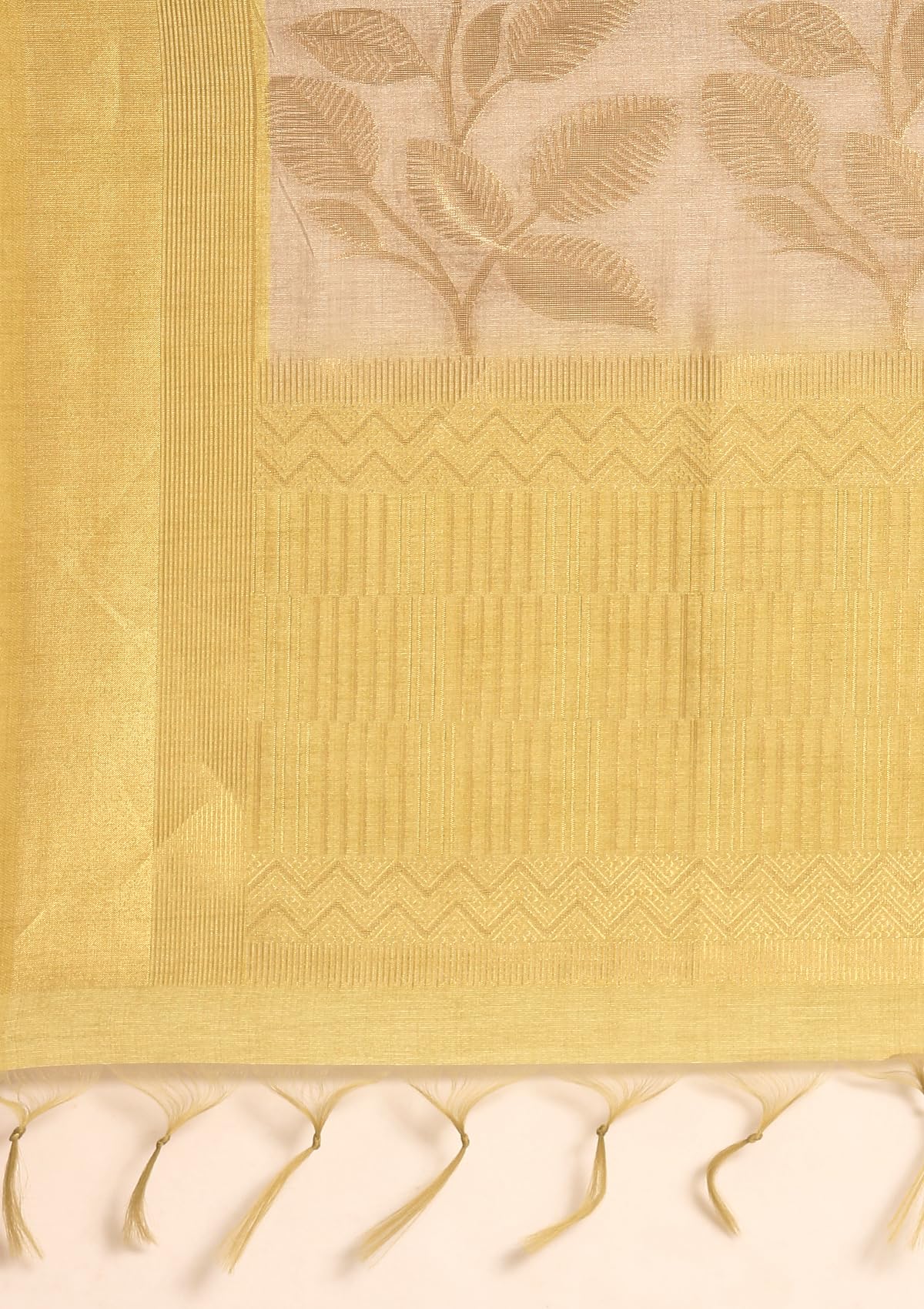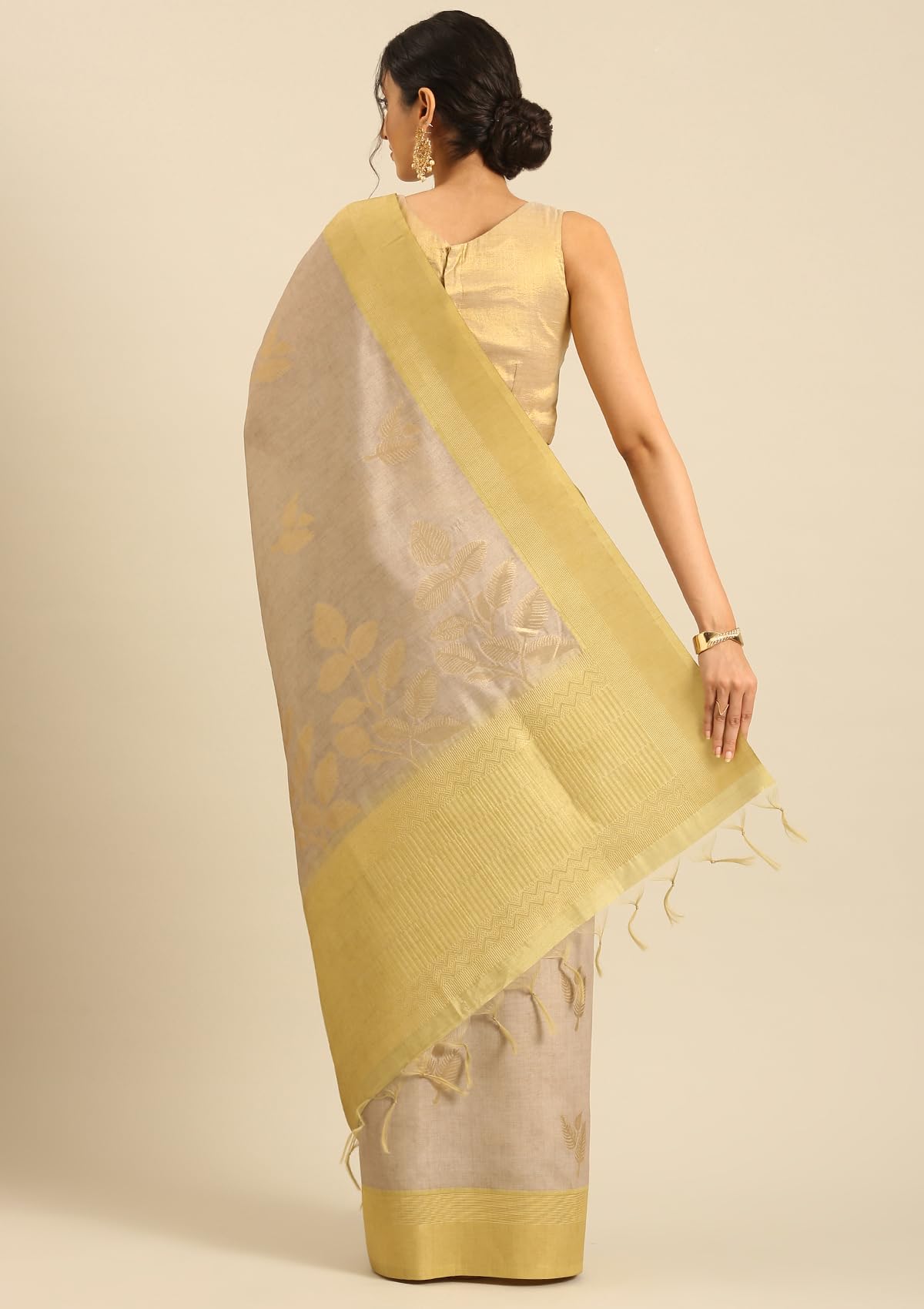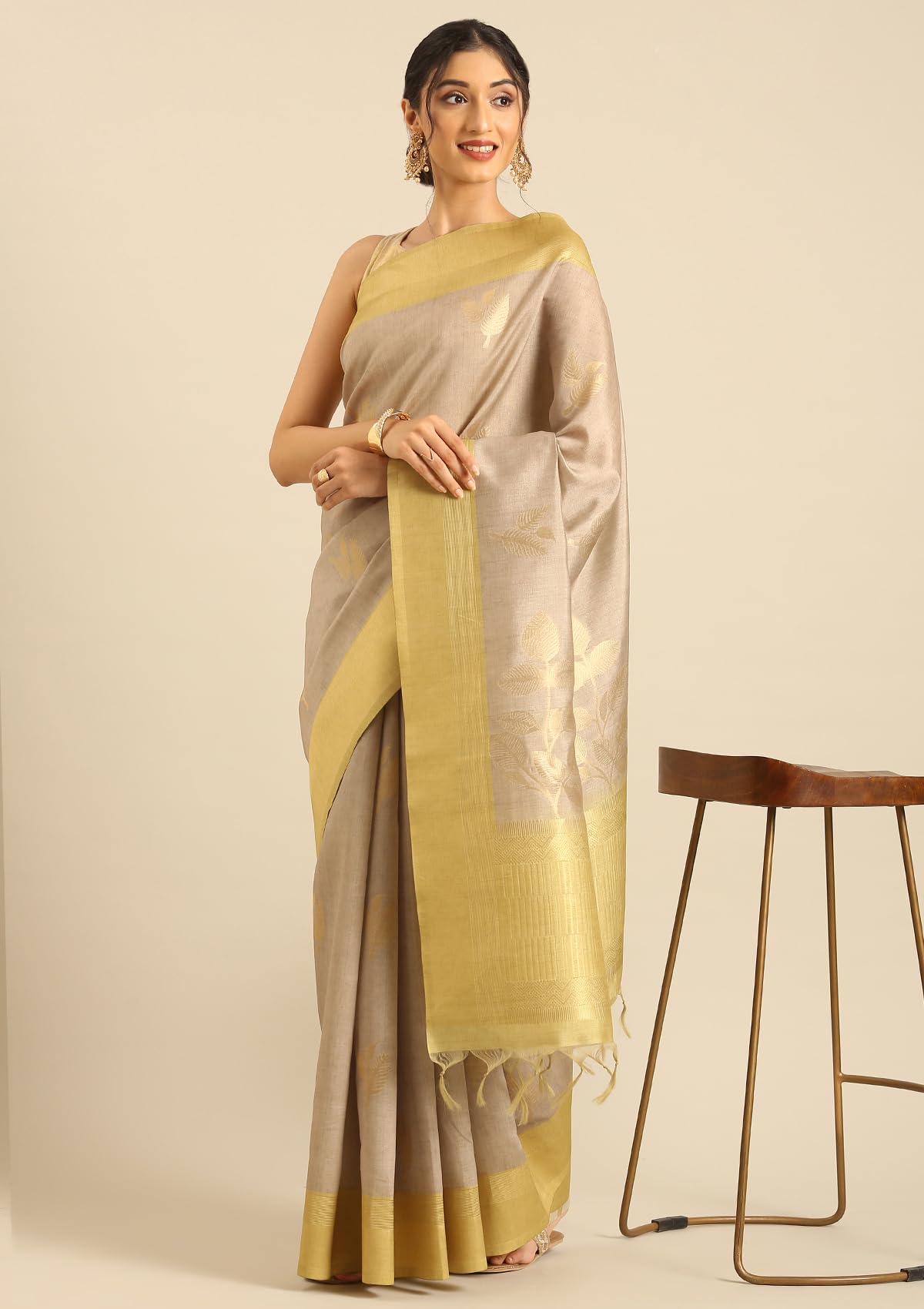 TAASHI Khadi Color Leaf Woven Tussar Saree with Green 4 Inch Zari Border And Leaf Design Pallu Includes Matching Blouse Piece
