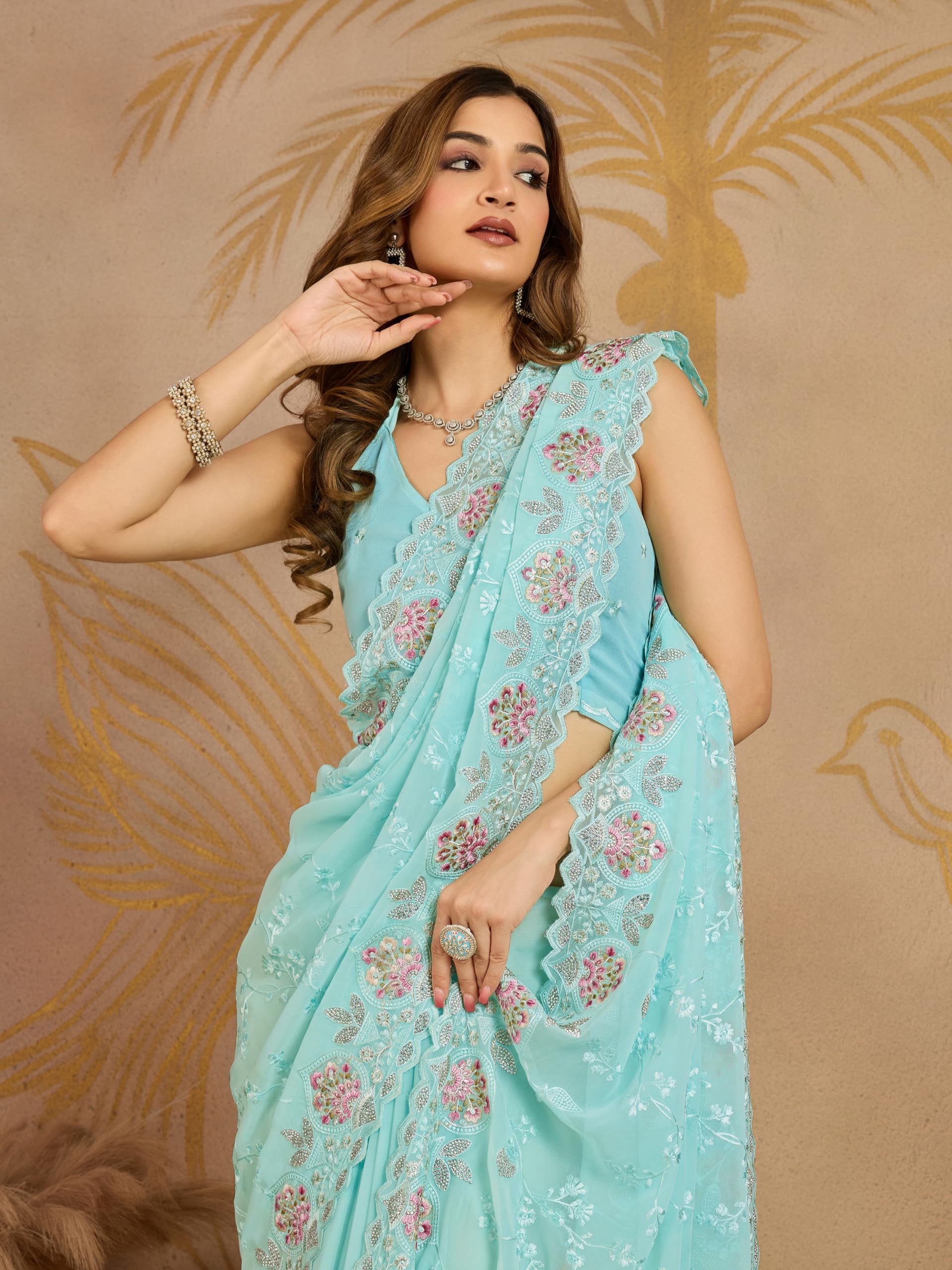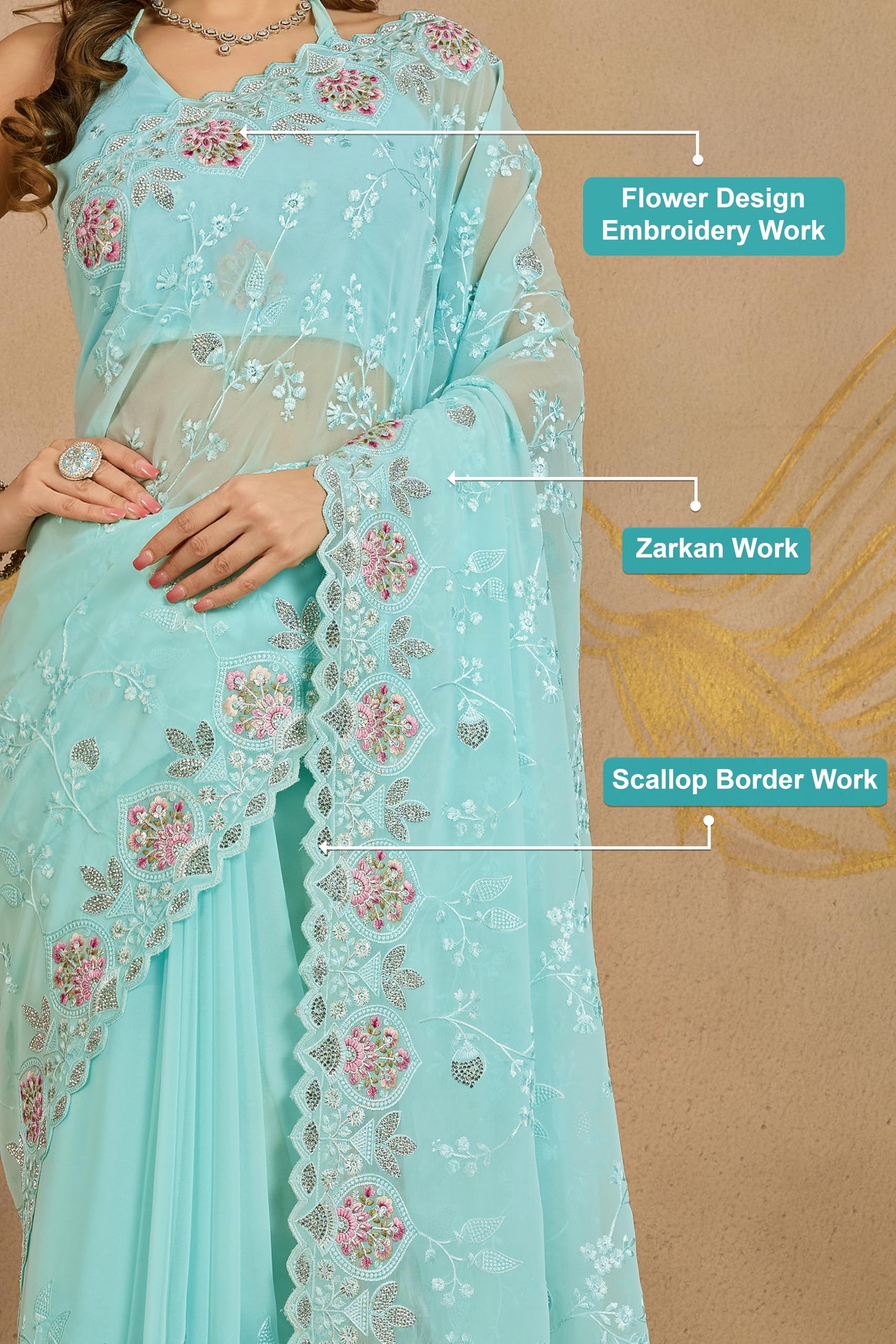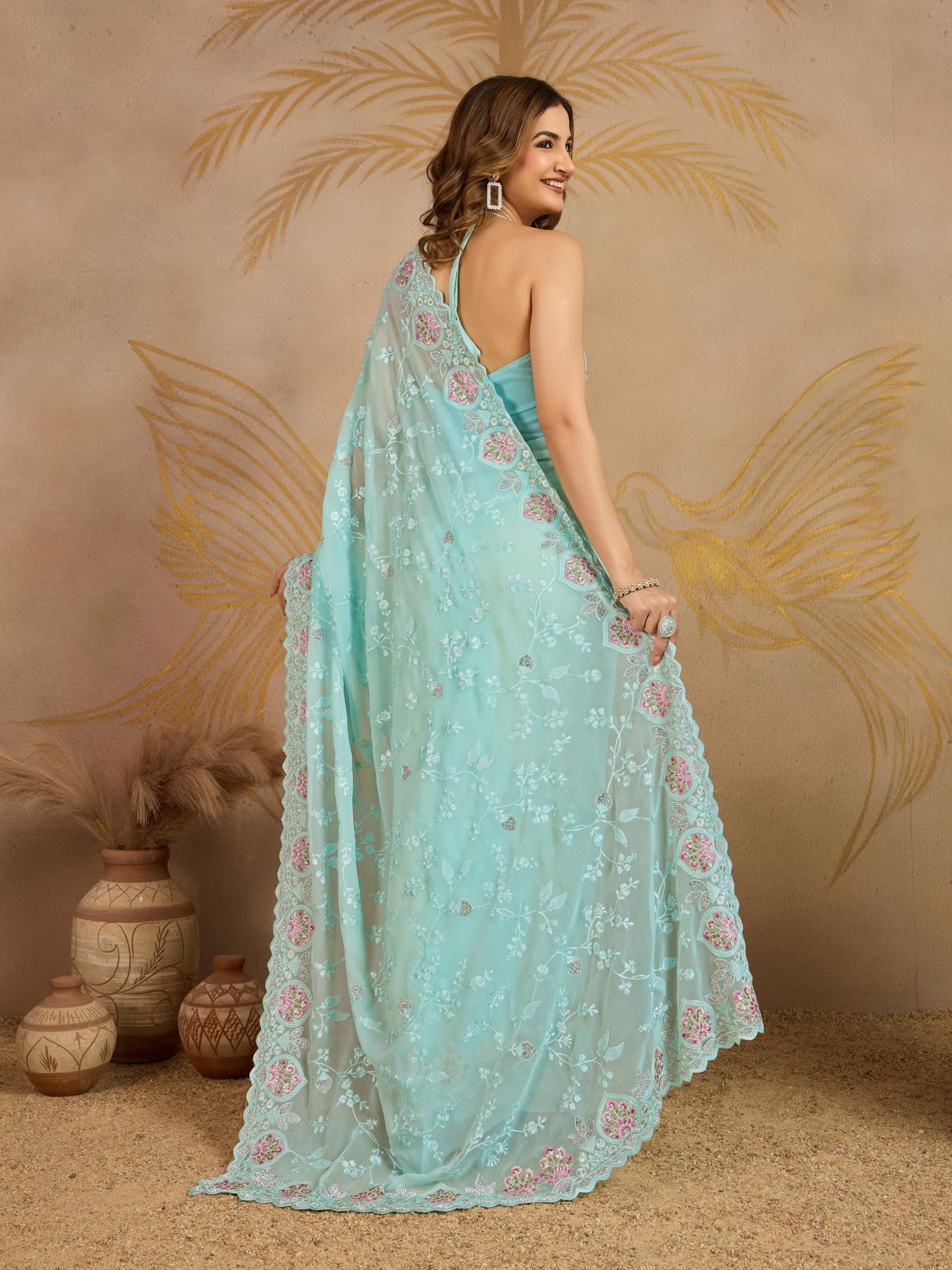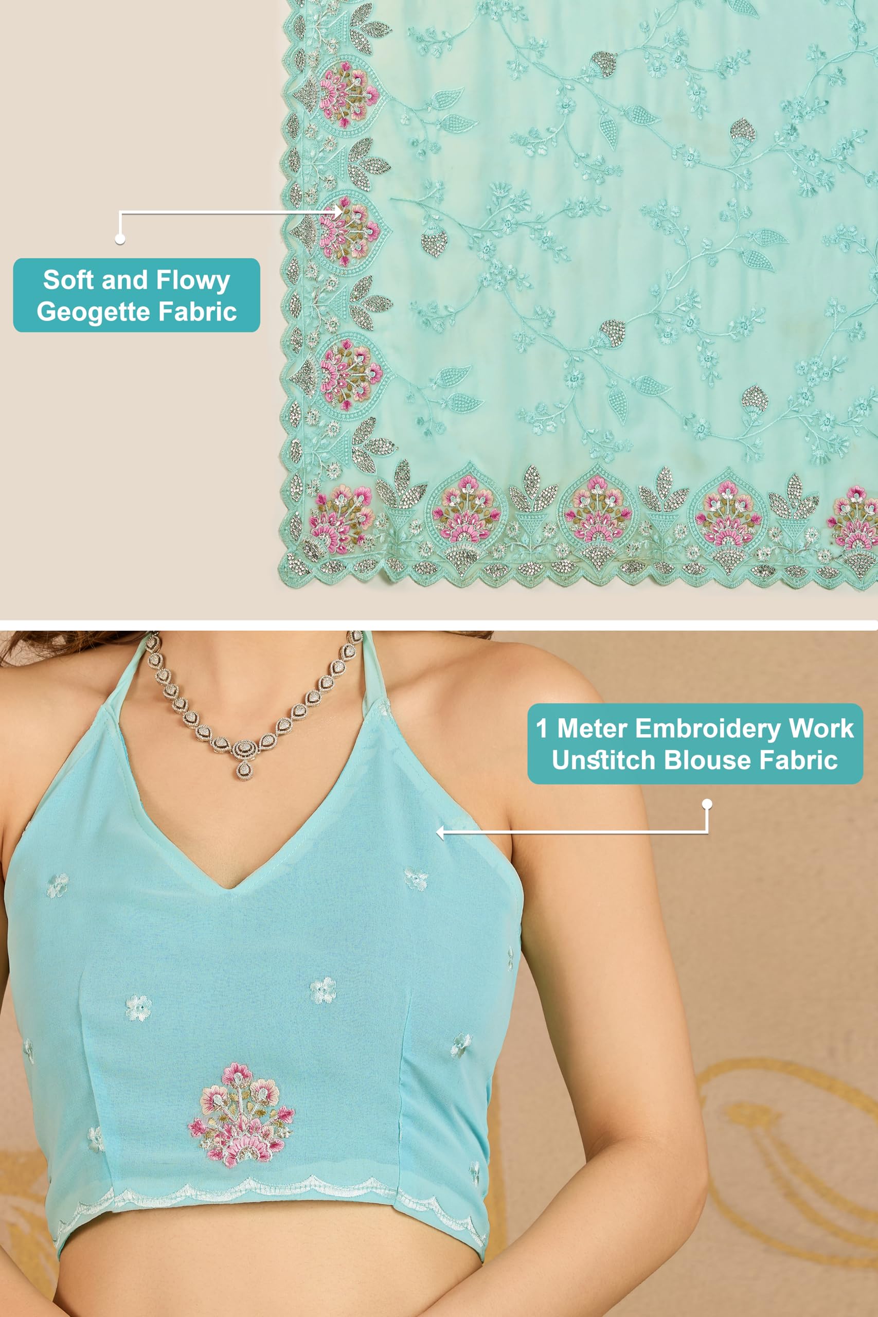 TRENDMALLS Women’s Georgette Embroidery Siroski work Saree with Unstitched Blouse Piece (K1239-Turquoise)