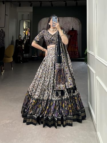 Women’s Tussar Silk With Patola Print And Foil Work Lehenga choli || For Navratri (Black)